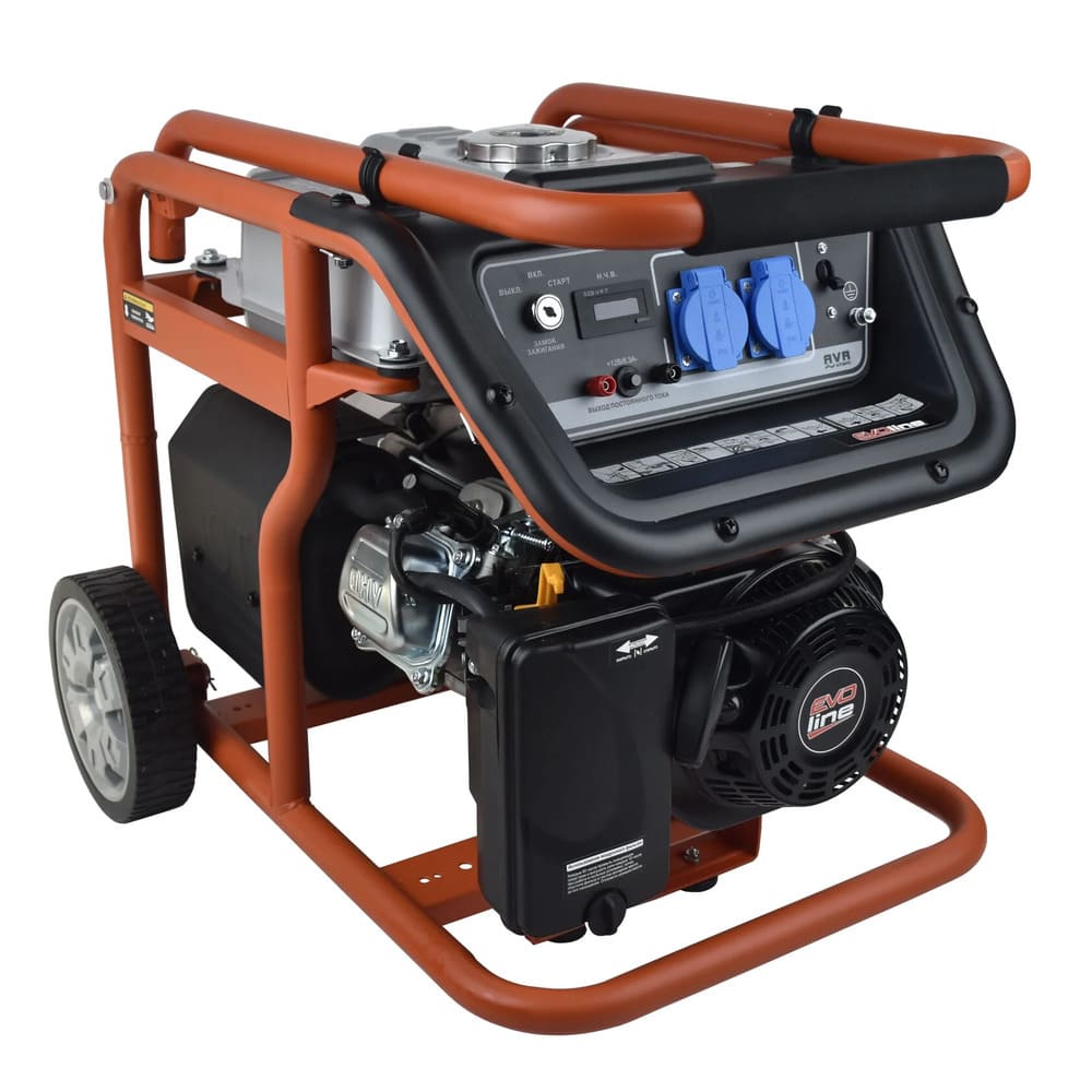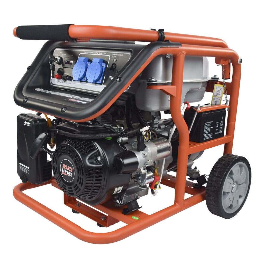 Электрогенератор EVOline KB 3300 E – бензиновый однофазный (1 фазный) генератор с максимальной мощностью 3 кВА. Силовым агрегатом данной модели является четырехтактный двигатель ZONGSHEN ZS170FE. Генератор оснащен электрическим запуском. Рама выполнена из высококачественной стали, которая служит не только для защиты двигателя, но и для удобной транспортировки электростанции. Объем топливного бака составляет 15 литров, что дает примерно 10 часов непрерывной работы в зависимости от нагрузки. Уровень шума при работе генератора составляет 76,5 дБ. Данная модель идеально подходит как для дома, так и для малого или среднего бизнеса. Оснащена транспортировочным комплектом с колесами, счетчиком мото-часов, электростартером и 2-мя розетками, имеет размер (590 x 440 x 500 мм) и вес (52 кг). Гарантия составляет 2 года.